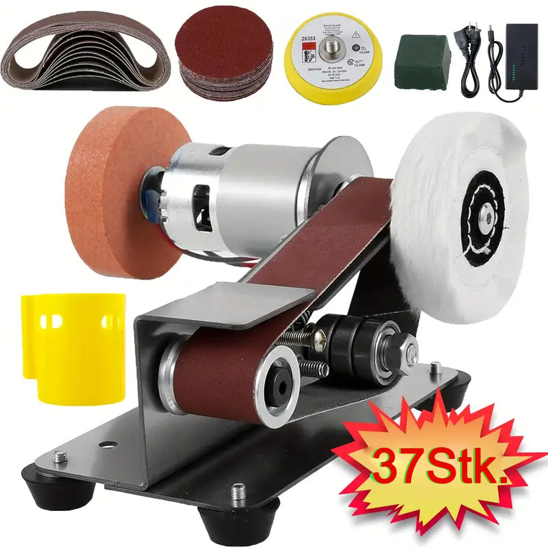 Vielseitiges Multifunktionswerkzeug: Mit einer Schleifscheibe und einer Stoffpolierscheibe verwandelt sich dieser Mini-Bandschleifer in eine kompakte Tischschleifmaschine – ideal für kleine Projekte und Bastler.