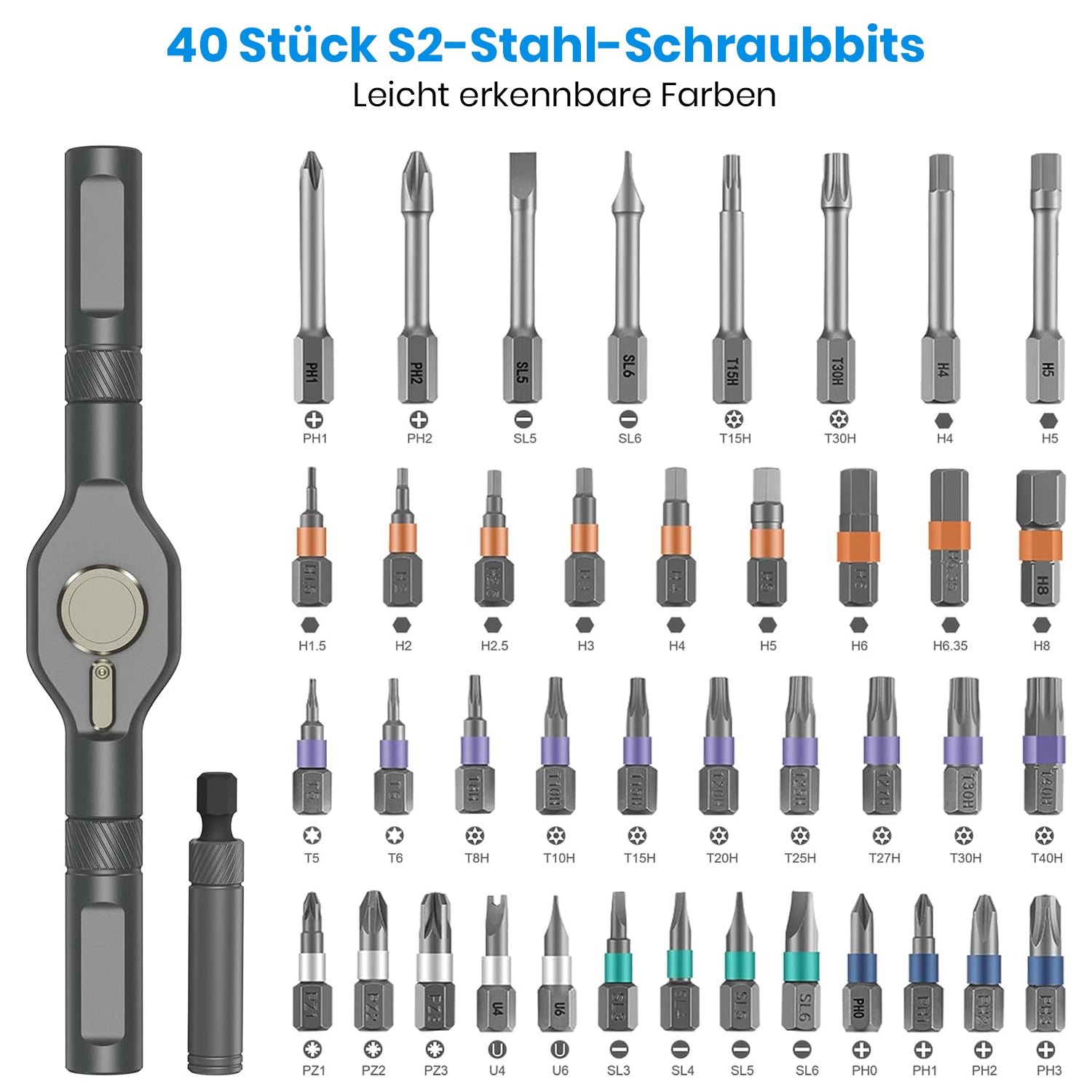 Umfassendes 42-teiliges Set: Ausgestattet mit 42 austauschbaren magnetischen Bits, enthält dieses Set alle wesentlichen Typen wie Schlitz, Kreuzschlitz, Torx, Sechskant und mehr. Perfekt geeignet für die Arbeit an Elektronik, Haushaltsgeräten, Möbelmontage und anderen kleinen Projekten, stellt es sicher, dass Sie immer das richtige Werkzeug für jede Aufgabe haben.