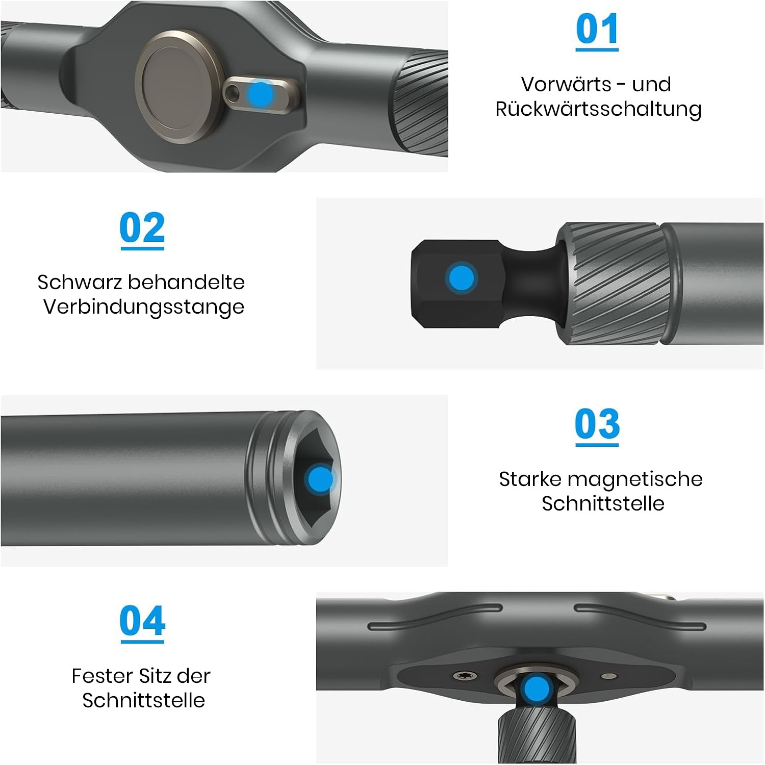 Magnetisches Design für Komfort: Der magnetische Bit-Halter sorgt für schnelle und einfache Bit-Wechsel und hält die Schrauben sicher an Ort und Stelle, um ein müheloses Festziehen oder Lösen zu ermöglichen. Keine verlorenen Schrauben mehr – der starke magnetische Griff verbessert Ihre Effizienz und Präzision bei der Arbeit an filigranen Projekten wie der Montage von Geräten, der Arbeit an Autos oder der Reparatur empfindlicher Haushaltsgeräte.